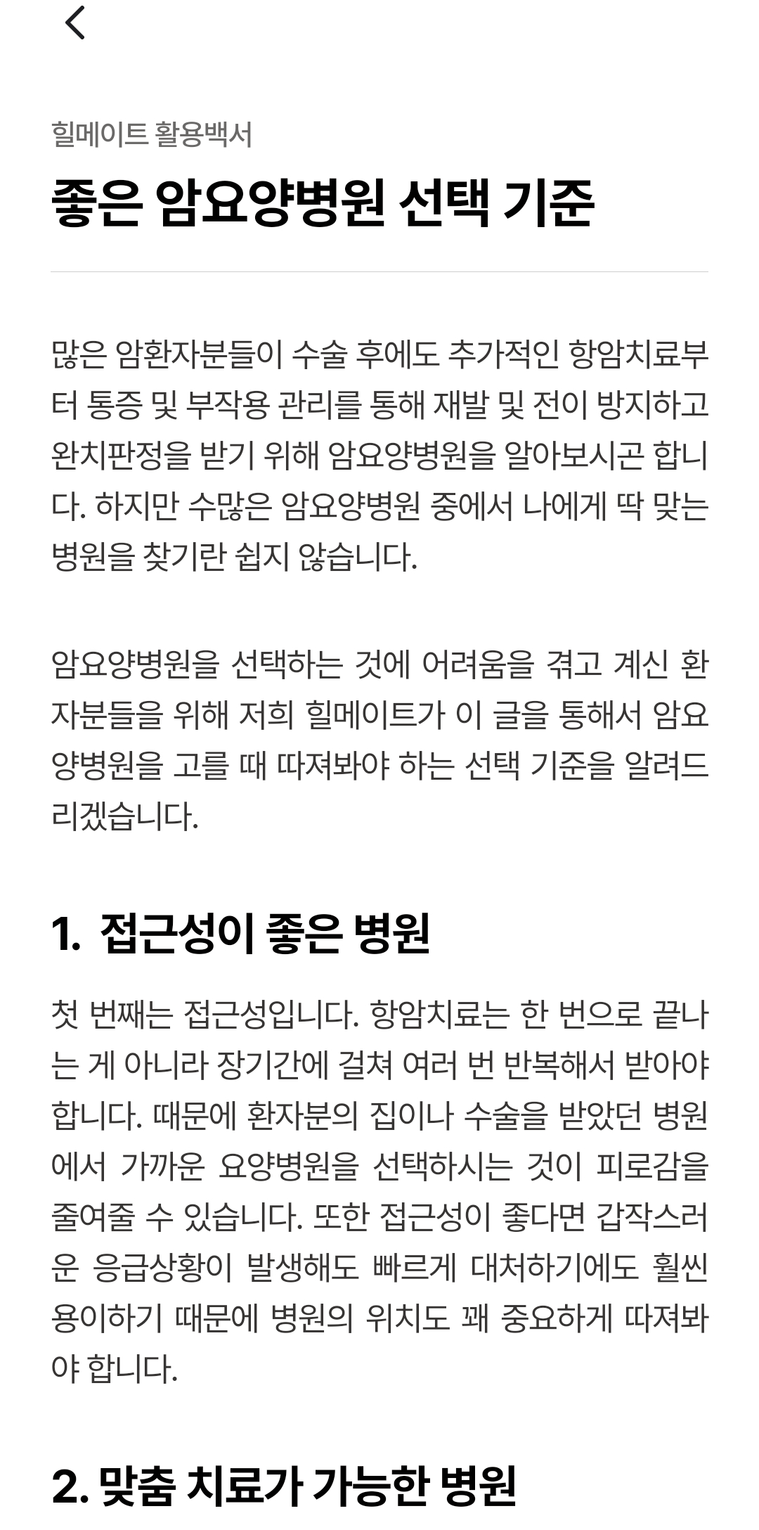 처음에는 포털 검색만으로도 병원을 찾을 수 있을 줄 알았어요. 그런데 막상 들어가 보면 모든 병원이 ‘암환자 케어 전문’, ‘회복 중심’이라는 문구만 가득할 뿐, 진짜 필요한 정보는 빠져 있더라고요.